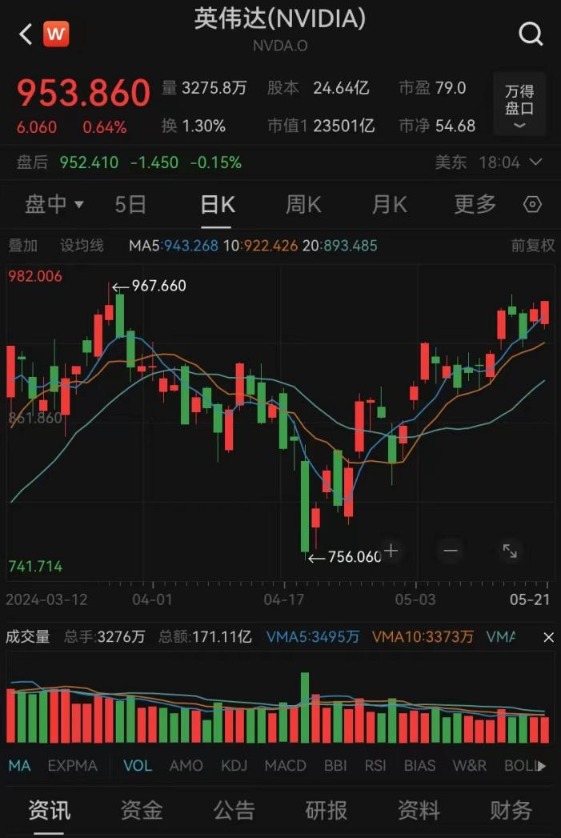 英伟达涨0.64%,收报953.86美元/股,创下收盘历史新高,最新总市值为23501亿美元。