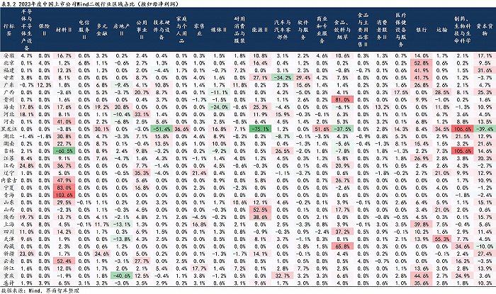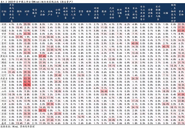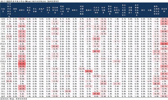 此外,材料II在青海、宁夏、内蒙古等区域占比较为显著,分别为78.9%、62.7%、53.3%,材料II主要包括化工,建材III,金属、非金属与采矿,容器与包装,纸与林木产品。多元金融在新疆以及黑龙江的占比均接近60%,其中新疆除了依靠申万宏源这家券商外,低息炒股配资公司中油资本也是其主要拉动项,而黑龙江主要是受中航产融带动,该公司是由中国航空工业集团有限公司控股的金融控股类上市公司,这或为黑龙江打造航空航天产业集群蓄力。资本货物在福建的占比为52.0%,主要受建发股份和宁德时代两家公司带动。
