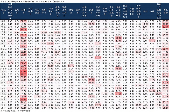 从行业净利润贡献看,制药、生物科技与生命科学在黑龙江和吉林占比分别高达106.6%和105.6%,主要贡献力量的上市公司分别是葵花药业和长春高新,材料II在青海和宁夏的占比分别为103.6%和83.0%,同样引人瞩目,不同于总收入的代表公司,对青海材料II做主要贡献力量的上市公司是盐湖股份。此外,食品、饮料与烟草在西藏占比也高达65.8%,这种优势已在总收入维度有所展示。让人略感意外的是天津的运输业,其行业占比达55.3%,在净利润的绝对数值上以313亿元排名行业第一,代表上市公司为中远海控,而向来以运输为代表的海南,在此维度却十分暗淡,净利润仅为5亿元。