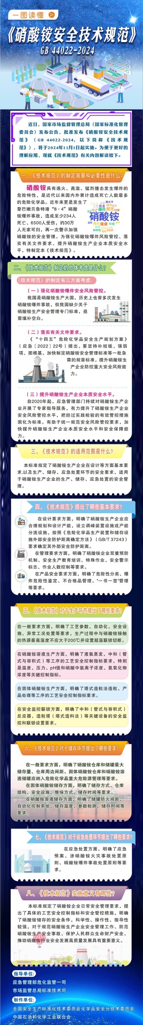 据应急管理部6月18日消息,应急管理部组织制定的国家标准《硝酸铵安全技术规范》(GB 44022-2024)于近期发布,自2024年11月1日起实施。