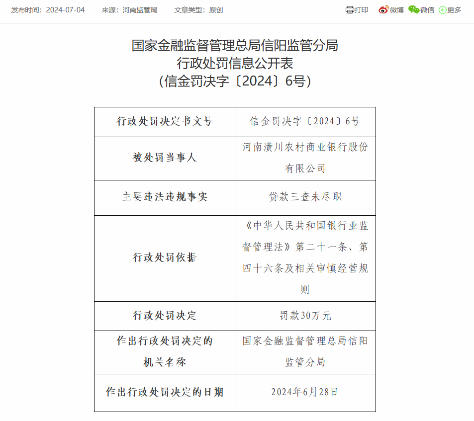 在线股票配资配资网站 河南潢川农商银行被罚30万元:因贷款三查未尽职